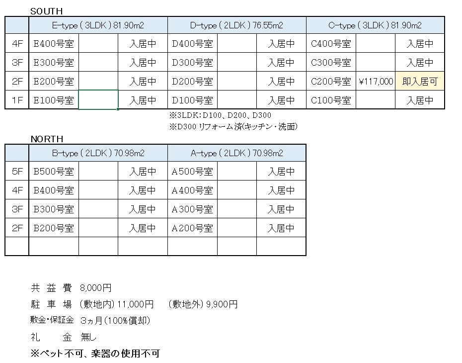 空き室&価格表